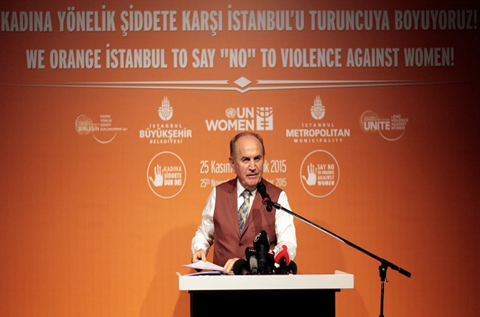 Törende konuşan Başkan Topbaş, “Çok anlamlı bir günde birlikteyiz. Birleşmiş Milletler’in özellikle sürdürülebilir kalkınma adına 2015 sonrası ile ilgili yapmış olduğu çalışmalar sonucunda BM’nin kabul ettiği 17 maddelik 2030 yılına kadar sürecek olan bu süre içerisinde ana hedeflerin beşinci maddesi olarak “Toplumsal cinsiyet eşitliği ve kadınların güçlendirilmesi “var. Bu kapsamda BM farkındalığı ortaya çıkarmak adına dünyada bugün başlatmakta olduğumuz 25 Kasım-10 aralık tarihleri arasında dünyada bir farkındalığı ortaya çıkarmanın gerekliliğini ortaya koydu ve bunun İstanbul ve Newyork’ta dünyaya ilan ediliyor. Zaman dilimi olarak biz Newyork’tan önce başlatmış bulunuyoruz. Özellikle bu çağrımıza katkıda bulunan ve bu farkındalığı orta çıkaran herkese İstanbul Büyükşehir Belediyesi adına ve konuğum adına teşekkür ediyorum. Her daim söylediğim gibi tüm insanların kaderleri birbirine bağlı. Böyle bir zaman diliminde yaşıyoruz. Geçmişte bir insan bir köyde bir kasabada bir şehirde hayatını tamamlar kendi dünyasını o kadar zannederdi. Şimdi insanın dünyası küçüldü dünyanın herhangi bir yerinde gerçekleşen bir olay tüm dünyayı etkiliyor. Ve bu dünyada bireyler olarak yaşamaktayız. Hepimizin mutlu olması gerekiyor. Bir toplumun medeniyet ölçüsü o toplumdaki tüm bireylerin kadın ve erkek diye ayırım yapmaksızın eşit bir şekilde o toplumda her türlü haklarından istifade edebilen ve her türlü yönetime katılabilen bir toplum olması gerekmektedir. Biz de bunu İstanbul’dan dünyaya haykırmaya çalışıyoruz. Özellikle kadına şiddete dur derken hayır da diyoruz asla diyoruz ve bununla ilgili tüm insanların bu hassasiyeti ortaya koymasını arzu etmekteyiz. Son 5 yılda 1134 kadın şiddetle hayatlarını kaybetmiş ve bunların yarıdan fazlası kendi eşleri tarafından veya partnerleri tarafından ve kendi evlerinde birçoğu . Bu dramatik bir tablo. Tabi bu insanların insani değerlerinin yok olduğunu gösteriyor. Halbuki gelişen dünyanın getirdiği güzellikler bizi daha fazla etkin hale getirmesi yaklaştırması gerekirken bunları görmekteyiz” dedi.