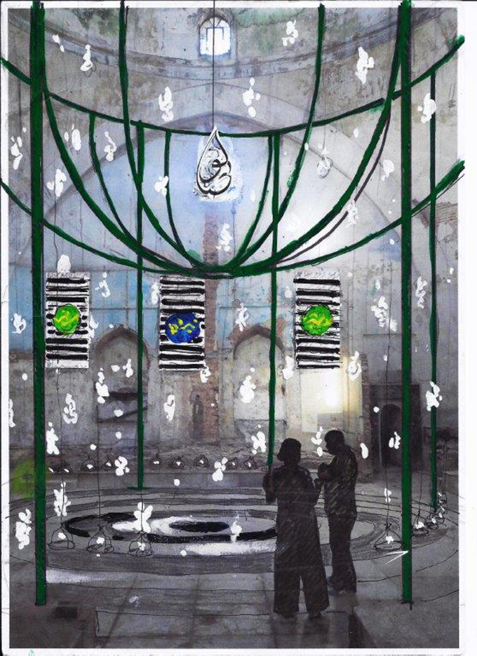 Bucarelli, hamamın devasa kubbesini Kuzey Yarım Küre gibi düşünmüş, metal çubuklarla meridyenler çizerek Güney Yarım Küre’yi oluşturmuş ve o alanda bir dünya elde etmiş. Dünyanın tam ortasına ise hat sanatının zenginliğini kullanarak su damlası şeklinde Arap harfleriyle ‘Su’ yazılı camdan bir ikon yerleştirmiş.