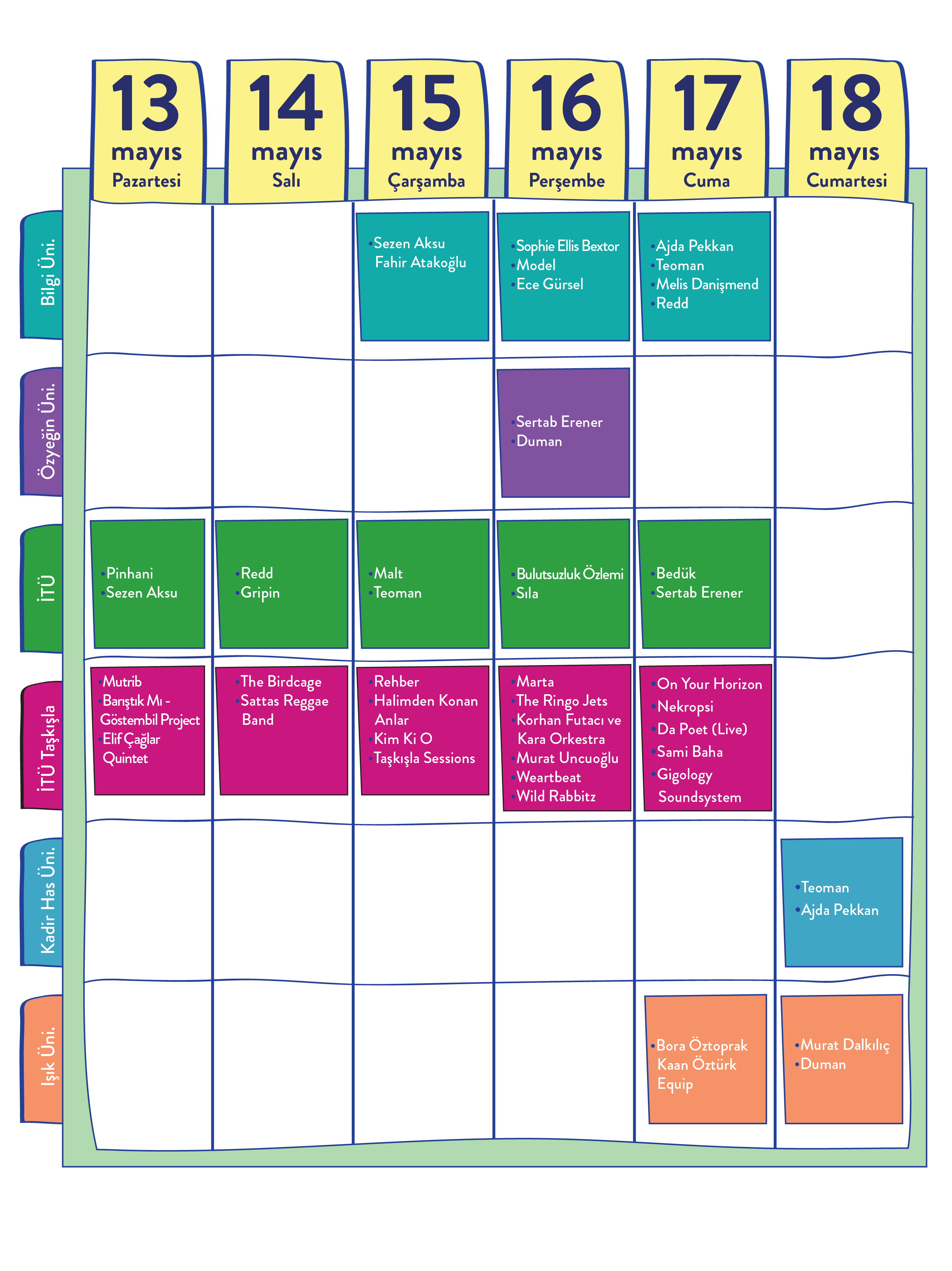 Üniversite öğrencileri için finallerden önce son çıkış, bahar şenlikleri dönemine hoş geldik. Tek tek bakmaya üşenip; istediğimiz müzisyenlerin konserlerini kaçırmayalım diye elimizden geldikçe hepsini bir arada gösterelim istedik. İki yerde birden çıkanı olur, biri kaçar biri yakalanır, hiç belli olmaz. Kısacası şimdilik, 13-18 Mayıs haftasında ne var ne yok aşağıdaki programdan bakabilirsiniz.