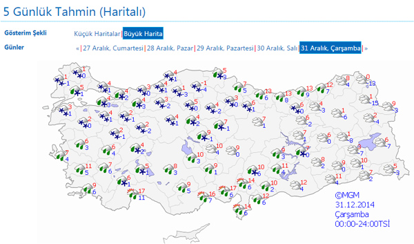 Meteoroloji İşleri Genel Müdürlüğü uzmanları, “Bu yılın son gününde, 31 Aralık’ta İç Anadolu ve Batı Karadeniz’in iç kesimlerinde, Trakya’da ve İstanbul’un bazı kesimlerinde karla karışık yağmur olacak.