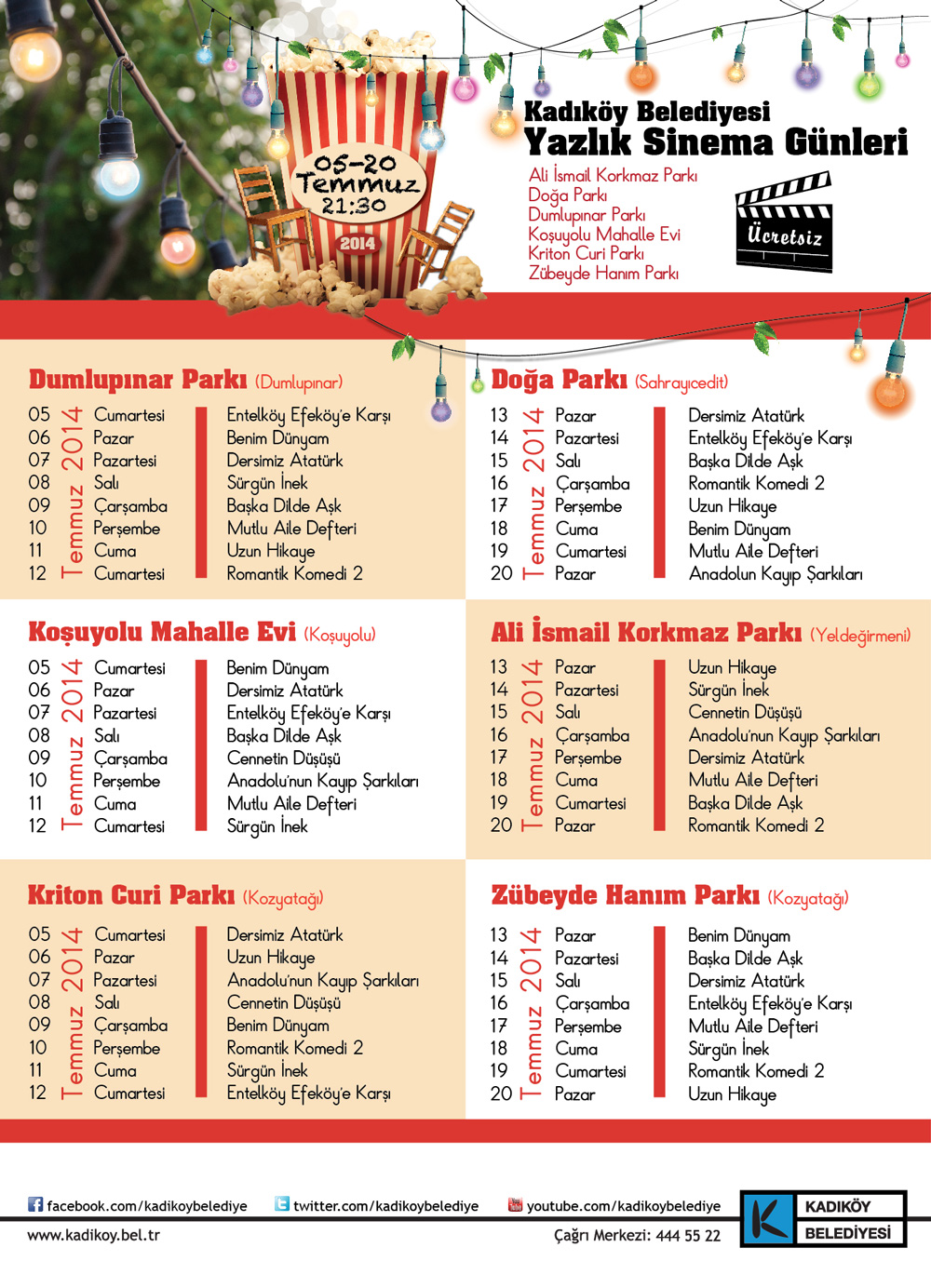 Her alanda özellikle gençlerin beğenisini toplayan Kadıköy Belediyesi, yine şahane bir işe imza atmış. Kadıköy Belediyesi Yazlık Sinema Günleri, 05 – 20 Temmuz 2014 arasında Kadıköy’deki çeşitli parklarda gerçekleştirilecek. Kaçırmayın!