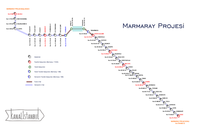 * Marmaray Demiryolu Boğaz Tüp Geçişi Projesi’nin 13,5 kilometrelik güzergâh üzerinde planlandı. İyileştirilmiş ve yeni demiryolu sisteminin tamamı, yaklaşık 76 km uzunluğunda olacak.
