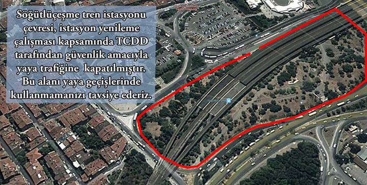 Kadıköy Belediyesi’nin facebook hesabından duyurduğu üzere, Söğütlüçeşme tren istasyonu çevresi, istasyon yenileme çalışması kapsamında TCDD tarafından güvenlik amacıyla yaya trafiğine kapatıldı.