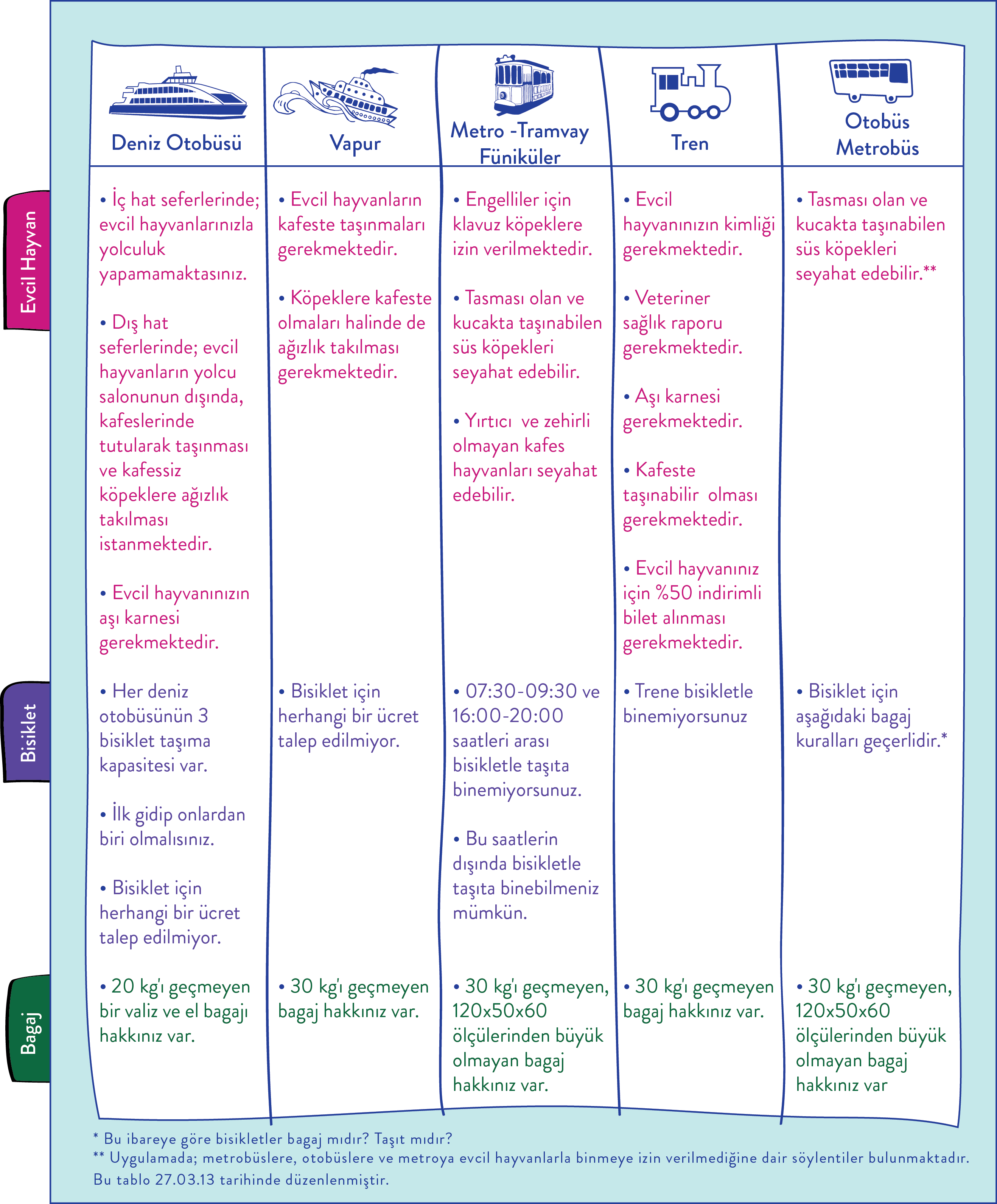 Bazen bisiklete binerken, arkadaşınızın bir telefonuyla karşı kıyıya geçesiniz tutar. Ya da öyle günler olur ki; hasta olan köpeğinizi veterinere götürmeniz gerekebilir. Kimi zaman da elinizde koca valizleriniz koştur koştur; uçağa, otobüse yetişmeye çalışırsınız İstanbul’un bir ucundan. Ancak böyle durumlarda beraberinizde getirdikleriniz bazen toplu taşıma kuralları açısından uygun olmayabilir. Bu yüzden kafa karışıklıklarını biraz olsun gidermek için; deniz, kara ulaşımı, raylı ulaşım demeden bu bilgilere kolay yoldan ulaşmanızı sağlayacak, kendimizce bir tablo hazırladık. Buyrun afiyetle tadını çıkarın. Keyifli yolculuklar.