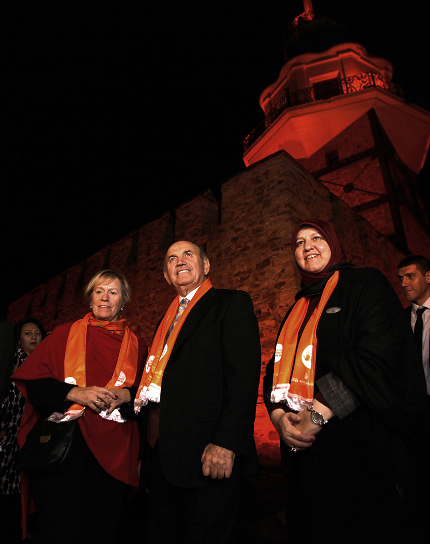 Kadınlara ve kız çocuklarına yönelik şiddeti sona erdirmeyi hedefleyen “Dünyayı Turuncuya Boya” hareketi Türkiye’de başladı. Birleşmiş Milletler Kadın Birimi’nin (UN Women) dünya çapında organize ettiği ‘Kadına Karşı Şiddetle Mücadele İçin 16 Günlük Aktivizm Kampanyası’ İstanbul Büyükşehir Belediye Başkanı Kadir Topbaş ve BM Direktörü Ingibjorg Gisladottir tarafından Kız Kulesi’nde başlatıldı.