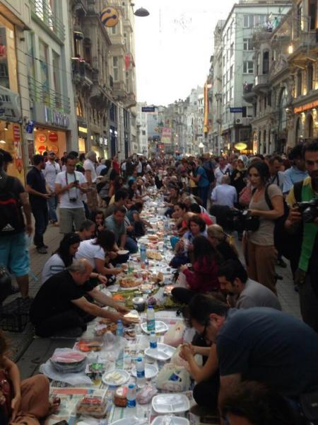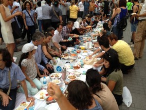 İşte bu sofralardan ikisi, Taksim Meydanı’nda ve İstiklal Caddesinde kuruldu. Meydanda Beyoğlu Belediyesi’nin kurduğu masalarda, Galatasaray Lisesi tarafında ise Antikapitalist Müslümanlar’ın yer sofrasında iftar düzenledi…